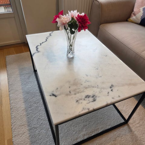 Ellos bord med rund bordplate. Marmor inspirert. Lite sidebord med rund, mørk bordplate og konisk understell. Egnet som avlastningsbord i stue, gang eller soverom til plassering av lys, vaser eller andre mindre gjenstander.