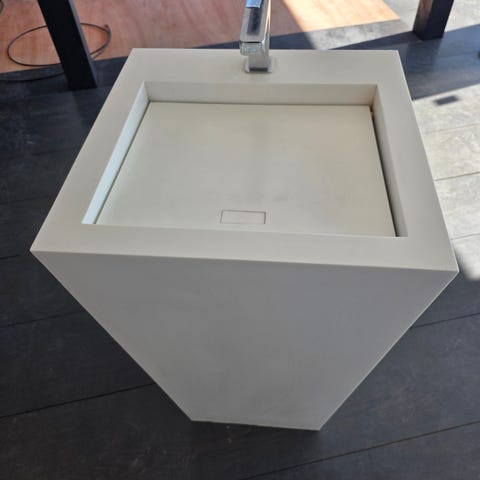 Hvit servantskap med integrert servant og blandebatteri, også tilhørende speil om ønskelig. Skapet har rette, glatte flater og moderne kantet design på servanten. Passer til montering på vegg i bad eller vaskerom. Underskap gir oppbevaring til baderomsartikler/ rengjøringsartikler. Blandebatteri og avløp inkludert. Størrelser; 60 cm bredde. Skapet 34 cm dybde og 48 cm høyde. Servant 11 cm høy og 43 cm dyp. Blandebatteri 15 cm høyt. Tilhørende speil med lys inkl. til 400,- ekstra
