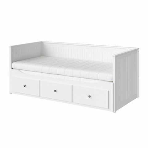 IKEA Hemnes dagseng med skuffer i hvit utførelse. Sengen har tre uttrekksskuffer under liggeflaten som gir ekstra oppbevaringsplass til for eksempel sengetøy eller klær. Kan brukes som enkeltseng til daglig og kan trekkes ut ved behov. Passer godt på soverom, barnerom eller gjesterom der det er behov for både seng og oppbevaring i ett møbel.