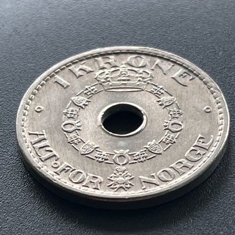 Norges Bank 1-krone mynt med hull i midten. Mynten er sølvfarget og har motiv med krone og teksten «ALT FOR NORGE» på den ene siden. På den andre siden er det korsformet motiv med kroner og teksten «HAAKON DEN SYVENDE NORGES KONGE» samt årstall. Egner seg som samlerobjekt eller til bruk i numismatisk samling.