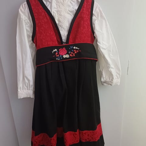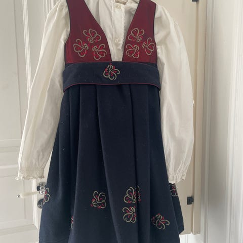 Superfin hjemmesydd festdrakt med høyt liv i ca str 104. Kan fint legges opp. Kan få med bunadssko i str 27 om ønskelig fra folklore. Vi brukte denne når hun var 4 og 5 år så jeg vil si den er mer 104 enn 98. Skjorte følger ikke med.