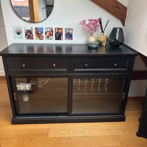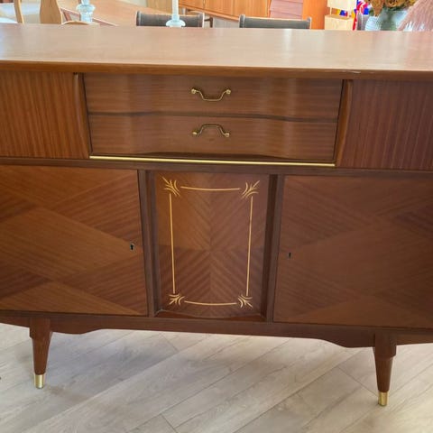Solid skjenk i massivt tre med rikelig oppbevaring. Perfekt til stue eller spisestue – skap, skuffer og plass til servise eller dekor.