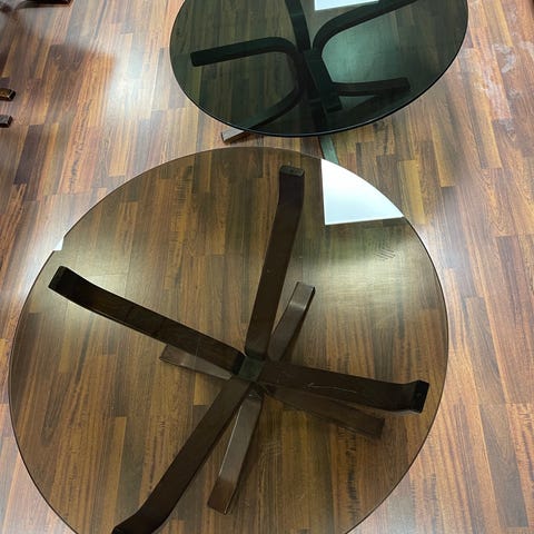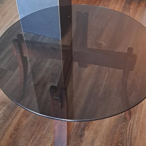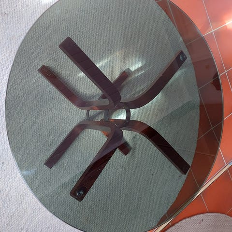 Brukt, rundt glassbord. Noen små slitasjemerker på beina. Grei stand.