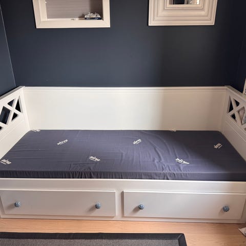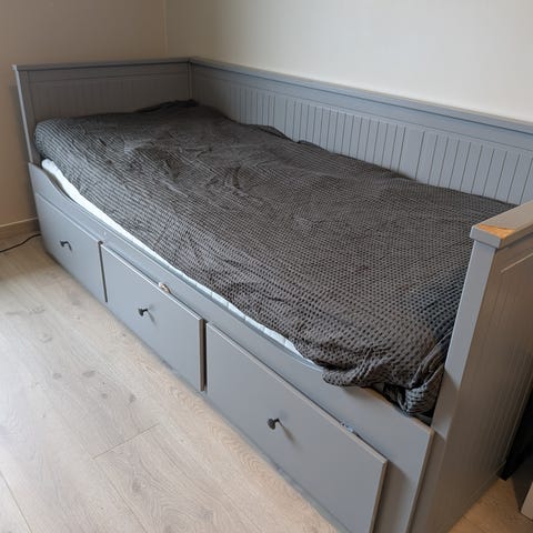 Godt holdt Hemnes Dagseng fra IKEA selges rimelig. Den er lys grå, tror ikke de har den fargen lenger på IKEA. Er i svært god stand, men noen små bruksmerker. Skuffene sklir lett inn og ut. Selges uten puter og madrasser. Sengen vil bli demontert og satt lett tilgjengelig. Nypris på IKEA er 3.595.