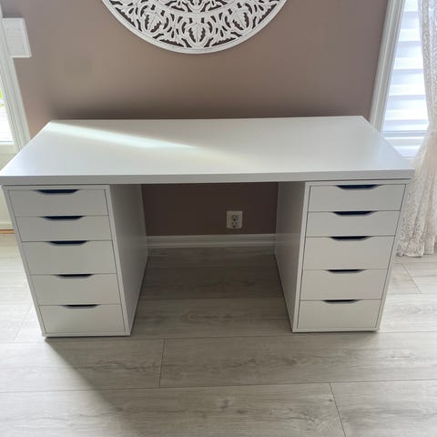 Fint skrivebord fra IKEA. Ble litt for stort, så selges. Ca 1 år gammelt. Lite merke på bordplaten, se bildet, ellers helt fin. Må bæres ut fra 2. etg. Jeg kan hjelpe om jeg er hjemme når hentes.