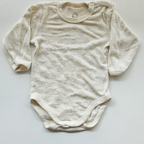 Søt body med lange ermer og rund hals i mykt, lysgrått mønster. 50 % ull, 45 % bambusviskose og 5 % polyamid. Hel og fin uten hull eller flekker, kun litt fargeslitasje rundt kantene som vist på bildene.