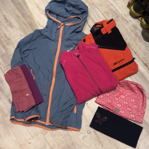 2 skalljakker tynne, 2 penjakker, 1 regnbukse og 1 dunjakke til pent.
