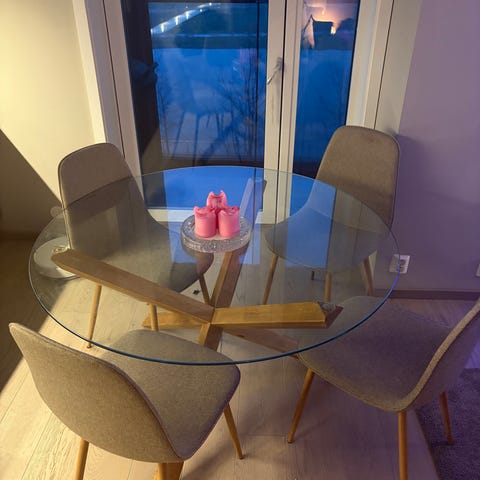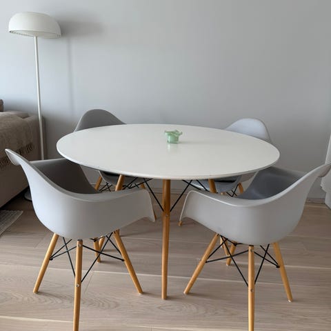 Selger denne fine spisegruppen. Bordet er ringsted og størrelsen er Ø100. Stolene er jonstrup.