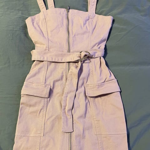H&M hverdagskjole i denim for dame i størrelse S. Kjolen er ermeløs med krage og hel glidelås foran. Den har to brystlommer med klaff og knapp, og er figursydd for en kroppsnær passform. Fargen er rosa, og materialet er denim som gir et litt robust uttrykk. Passer som enkel hverdagskjole eller til uformelle anledninger.