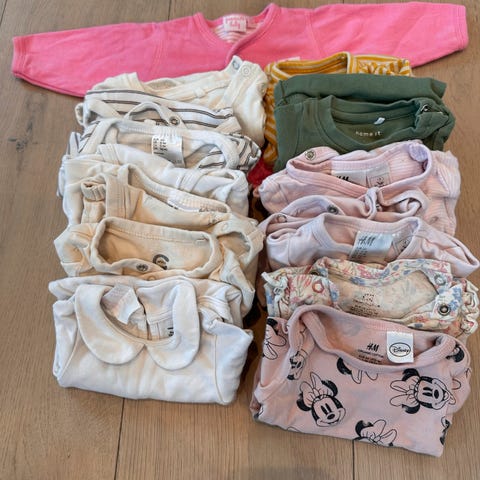 Selger stor klespakke i størrelse 50. Bodyer og bukser fra nameit, HM, gerber, primark. Alle pysjer fra primark minus en i ull fra joho og en fra HM.
