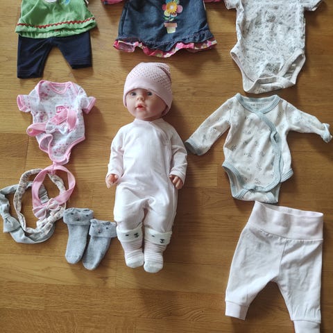 dukkeklær sett flerfarget. Pakken inneholder ulike plagg til dukke, blant annet bodyer, kjoler, bukser, sparkedrakt, smekke og tilbehør i flere farger som rosa, hvit, blå, grå og mønstrete varianter.