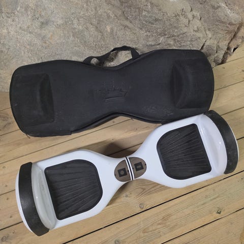 Hoverboard selvbalanserende brett i svart farge. Brettet har fotplater med sklisikre gummimatter og to hjul på sidene. Det leveres med strømadapter/lader som vist på bildene. Egnet som elektrisk ståbrett for én person til kortere turer på jevnt underlag.