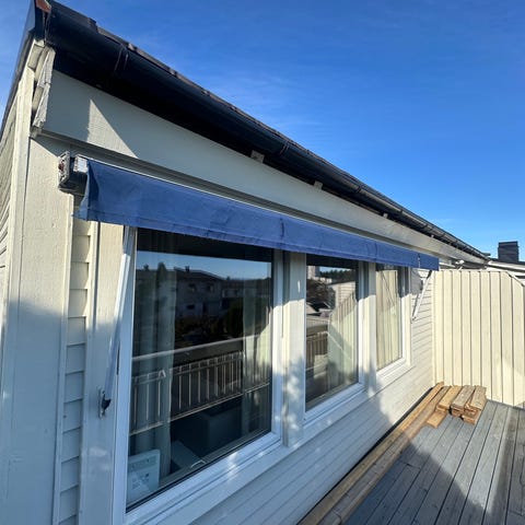 Har en markise på 5 meter som selges med motor og fjernkontroll.