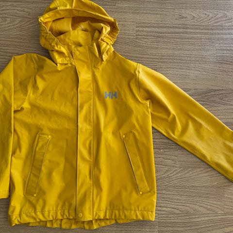 Helly Hansen regnjakke for barn, unisexmodell i størrelse 152. Jakken er gul og laget i polyester. Den har hette, glidelås foran med beskyttende klaff og trykknapper, samt lommer i siden. Ermer med trykknappjustering ved mansjettene. (Trykknapp på høyre mansjett er borte, se Bilde) Egnet som ytterjakke i vått vær for barn i størrelse 152.
