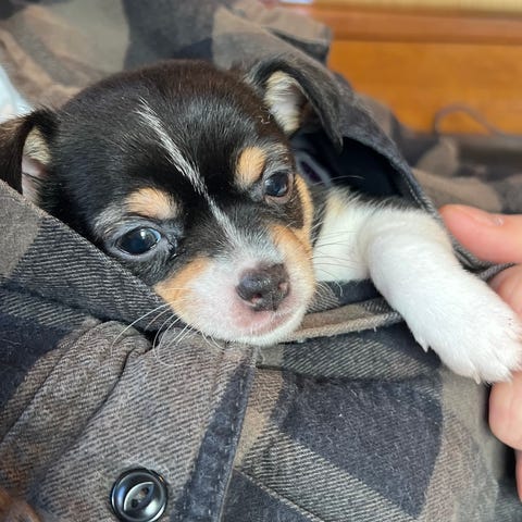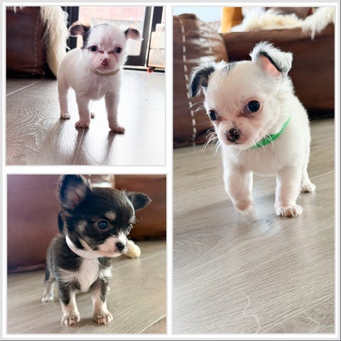 Nydelig liten chihuahua blandingsvalp jente født 2.mars 2026.Leveringsklar 1.mai. Teddy er sunn og frisk og veldig menneskekjær. Stille og rolig gemytt. Teddy ser ut til å få lengre pels enn sine søsken. Vi har kalt henne Teddy da hun ligner litt på en teddybjørn❤️Usikker på om pelsen blir lang eller om den blir litt halvlang og bølgete. Teddy er godt sosialisert med mennesker og dyr på gården våres. ( 2 voksne hunder og 2 katter) Hun leveres med helsesjekk, vaksine og ormekur. Hun får også med teppe med lukt av mammaen. Regner med at hun blir rundt 3 kg som foreldrene eller kanskje litt mindre da hun er den minste i kullet.