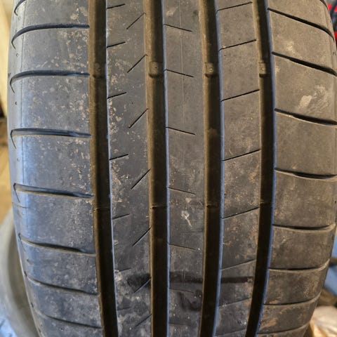 Selges etter bytte av bil. To av dekkene har meget god mønsterdybde, de to andre er som nye. Noen små skrammer på felgene, se bilder. Oppbevart rene og tørre på dekkhotell over vinteren. Hentes i Tønsberg.