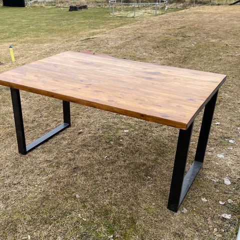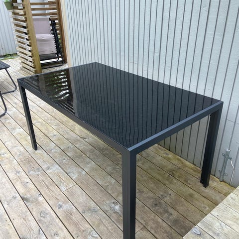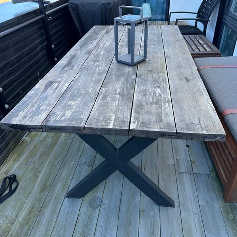 Rektangulært spisebord med bordplate i tre og understell i metall, for bruk utendørs.