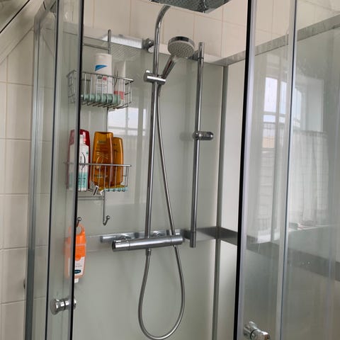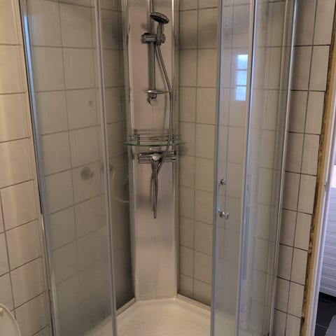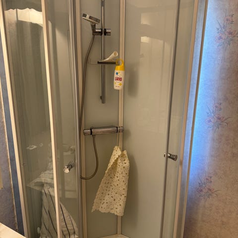Norgesdusjen dusjkabinett med skyvedører. Kabinettet har integrert dusjpanel med hånddusj, blandebatteri og hylle til såpe eller andre dusjprodukter. Glassdørene har håndtak på begge sider. Egner seg for montering på bad med flislagte vegger og avløp tilpasset dusjkabinett.