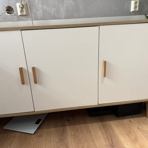 God oppbevaringsplass med hyller bak tre dører – perfekt til TV, spillkonsoller og annet utstyr.