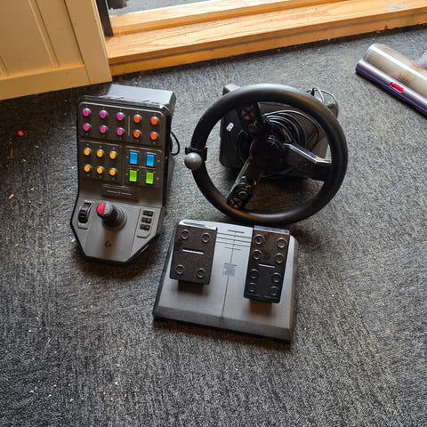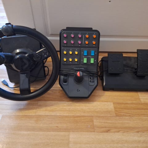 Logitech G Saitek Farm Sim ratt og pedaler med kontrollpanel i svart.