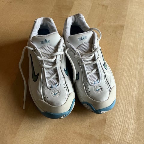 Nike Air Monarch IV joggesko i hvit og marineblå farge i størrelse EU 40,5 (US 7,5).