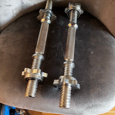 Hantelsett med to justerbare manualer i metall. 8 skiver på 1.25 kg og 4 skiver på 0.75 kg. Må hentes.