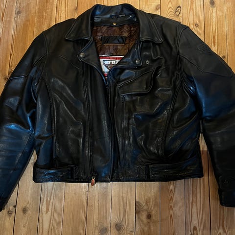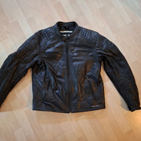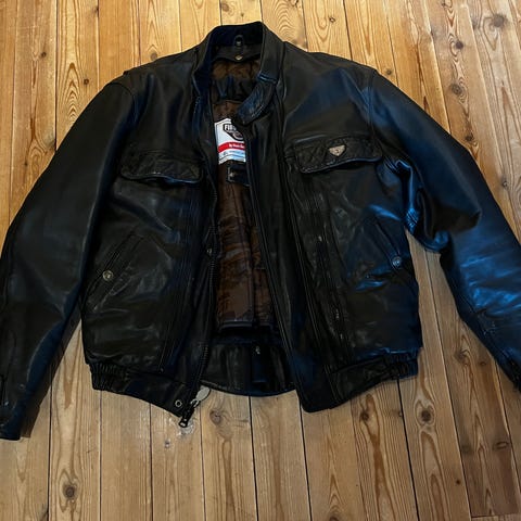 Bullfighter skinnjakke i størrelse XL. Jakken er laget i ekte skinn med fôr av 50 % polyester og 50 % bomull.