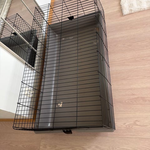 Smådyrbur i metall med plastbunn. Buret har gittervegger og -tak, samt en bunnskål i plast som gjør rengjøring enkelt. Buret passer for gnager som f.eks. marsvin, som det har blitt brukt til de siste årene. Buret er 140 cm langt.