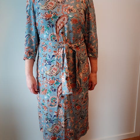 Spesielt fin kjole fra Rodebjer. Kjolen er helt ny og ubrukt. Kjolen er laget i viskose og har er vakker blomster- og bladprint med blant annet blå, gule og mørke toner. Modellen har lange ermer og rund hals med knappelukking bak. Stoffet faller tungt og elegant og gir et mykt uttrykk. Passer til bruk ved spesielle anledninger. Ny pris 4500,-