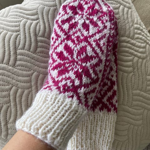 Ullvotter til dame. Vottene er strikket i ullgarn med stjernemønster. Gir god varme til hendene. Lengden på vottene fremgår av bildet med målebånd.