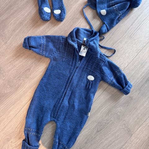 Dressen er i blå ull med hel glidelås foran og ribb nederst på ermer og ben.
