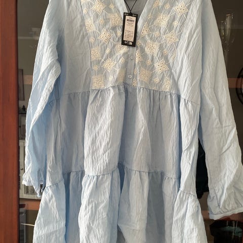 Fila hverdagskjole for dame i størrelse L. Kjolen er laget av bomull og har et blåmønstret stoff. Modellen har ermeløst snitt med halterneck-lignende overdel. Kjolen er veldig kort og passer bra til stranda og sol og sommer