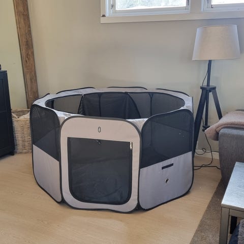 Tiaki sammenleggbar valpehage i grå og svart tekstil med nettingfelt. Åttekantet innhegning egnet for valper og små dyr. Topp med glidelås og netting for lufting og innsyn, samt døråpning i siden. Kan brettes sammen for enkel oppbevaring og transport. Passer til bruk både inne og ute på jevnt underlag.
