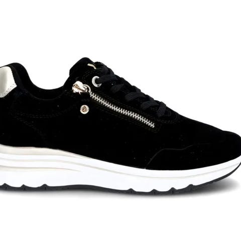 Rieker sneakers joggesko i størrelse 39. Modellen er i svart med hvit såle og har både snøring og glidelås på siden. Overdelen består av tekstil og syntetisk materiale med strukturdetaljer på tåpartiet. Skoene har polstret kant rundt ankelen og en oppbygd yttersåle som gir god støtte ved hverdagsbruk og lett gange.