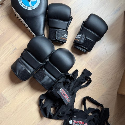 Actio boksesekk med tilhørende slagpute og flere par boksehansker. Boksesekken er sylinderformet med oppheng i toppen. Slagputen er rektangulær med håndtak på baksiden for å kunne holdes av en treningspartner. Det følger med minst to par hansker i ulike modeller og farger, blant annet svarte hansker fra X-Fight og røde/svarte/hvite boksehansker. Utstyret egner seg til boksing og annen kampsporttrening, både til slag mot sekk og til partnerøvelser med slagpute.
