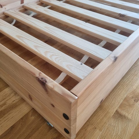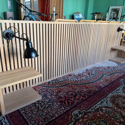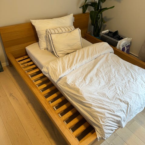 Selger japansk inspirert sengeramme med nattbord i heltre kirsebær. Sengen har vært spesialdesignet, men ble veldig lite brukt. Stort sett lagret på tørt loft. Noen få merker. Yttre mål H 34x L 230 x B 170 cm. Passer til en 200x140 madrass.