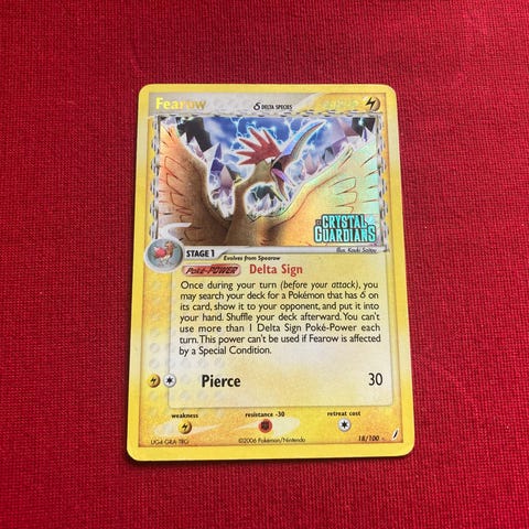 Fint eksemplar av spearow med stamp fra ex crystal guardians. Front og holo ser veldig bra ut, noe whitening bak, men ingenting betydelig.