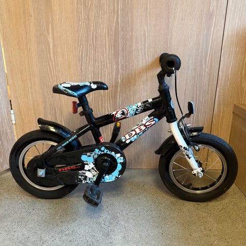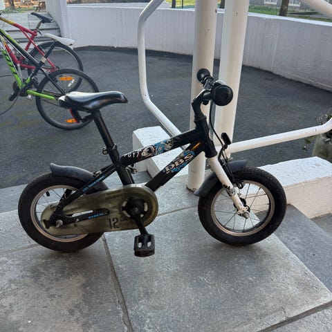 Barnesykkel 12" med styrestang i svart/blå farge. Sykkelen har hel kjedekasse, pedaler med refleks og brems foran. Sete og holker er tilpasset barn, og det er montert en styrestang bak slik at en voksen kan hjelpe til med styring og fart. Egnet som første tråsykkel for barn som skal lære å sykle på 12" hjul.