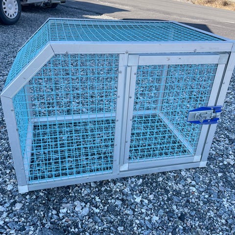 Hundebur i aluminium til mellomstor / liten hund . 89x55 cm grunnflate , 43 x 55 flate i topp, høyde 65 cm. Solid antiskli matte i gummi. Venstre hengslet. Først til mølla da driver med rydding av bod