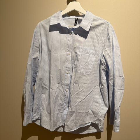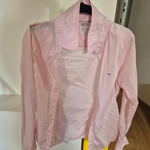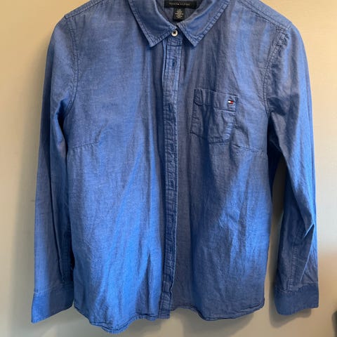 Tommy Hilfiger skjorte i størrelse L. Passer både menn og dame. Skjorten er blå og laget av bomull. Klassisk modell med krage, lange ermer og knappelukking foran. Passer til både hverdagsbruk og mer formelle anledninger.