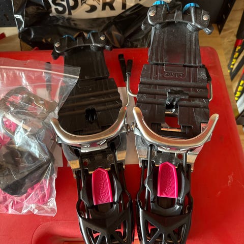 Knallgode NTN telemarkbindinger. Disse er nokså mye brukt, og en plastdel er brukket. Skruene må nok også byttes ut. Ser at Rottefella selger skruer til 35kr og reservedel av den som er brukket til 399kr på denne siden: