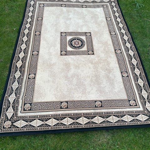 &Tradition teppe i rektangulær form med klassisk, ornamentert mønster. Teppeflaten er hovedsakelig beige, med ramme og felt i burgunderrød og beige med dekorative detaljer. Passer for bruk i stue, spisestue eller andre oppholdsrom der man ønsker et tradisjonelt, mønstret teppe på gulvet.