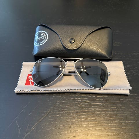 Ray-Ban solbriller for unisex med klassisk pilotfasong. Modellen har svart innfatning og mørke, graderte glass. Leveres med originalt Ray-Ban-etui og pusseskinn, som vist på bildene. Egner seg for daglig bruk i sollys.