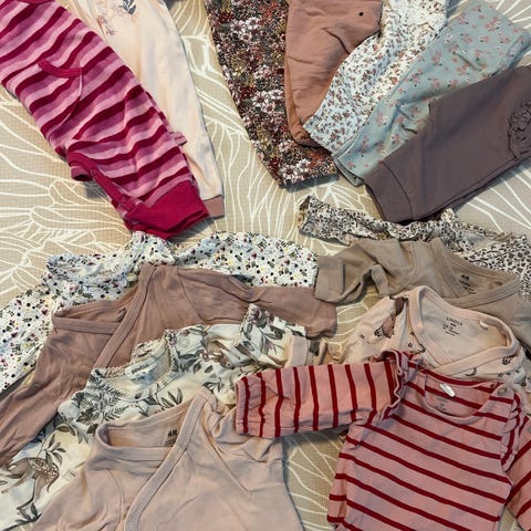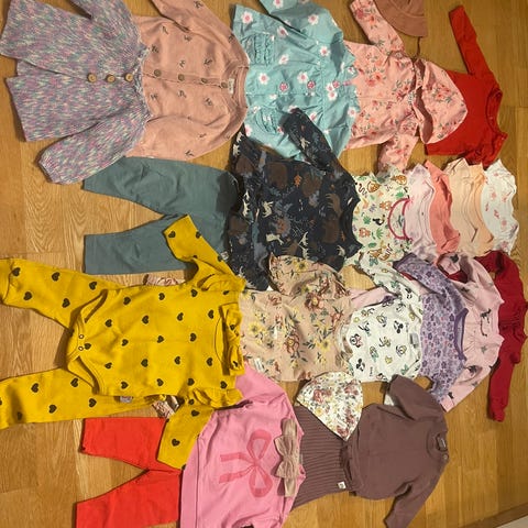 Babyklær til jente str 50 og 56. Bodyer, bukser og pysj.