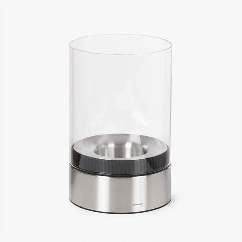 Designet av Halvor Bakke, håndlaget med mørk eikesokkel og munnblåst glass i fargen topaz.