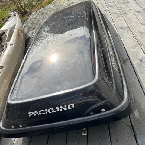 Packline takboks i svart farge med lås. Aerodynamisk formet boks for montering på takstativ på bil. Egnet for ekstra bagasje, ski, golfutstyr og annet utstyr på bilturer. Åpnes fra enden og har flere festepunkter til takstativ i bunnen.