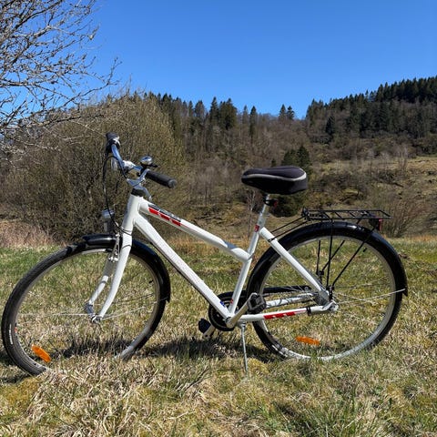 Bukkestyre, 10 gir (Shimano), trommelbremser, dynamo for strøm til front og baklykt - som alle virker, fastmontert lås m/nøkkel, skjermer, avstandsholder, bagasjebrett, refleks på pedaler og hjul. Tåstopper for sko på pedalene.