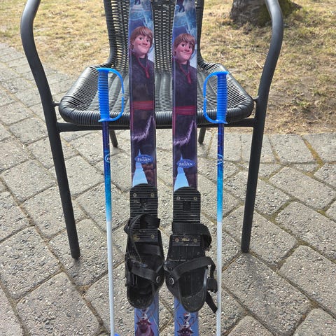Barneski i plast med blå farge og motiv. Skiene har enkle reimer/bindinger som festes rundt skoen, og passer til de minste barna som skal prøve ski for første gang. Egnet til lek og enkel skigåing på flatt underlag eller i hagen.