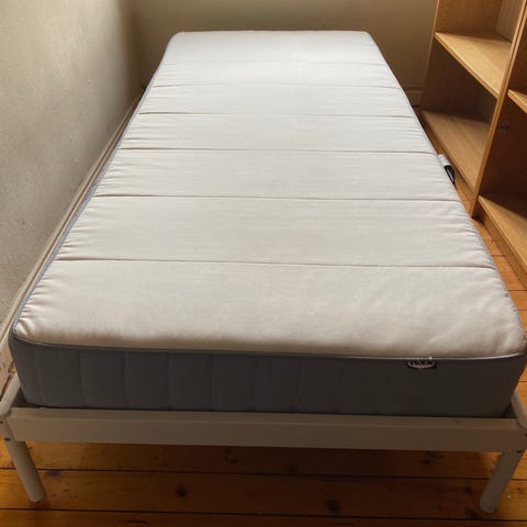 Gis bort grunnet flytting. Helt fin som gjesteseng og fortsatt god å ligge i. Overmadrass har stor flekk på den ene siden, men trekket er vasket etter flekken kom.