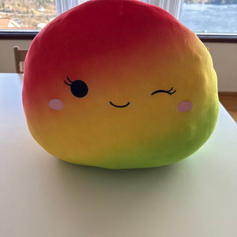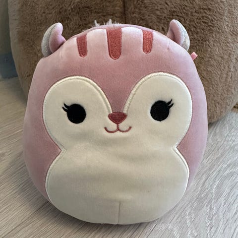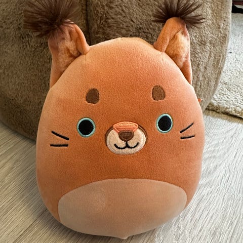 Squishmallows, kosedyr formet som et ekorn i brun og hvit farge. Myk og rund figur som egner seg som kosebamse eller pyntepute på barnerom eller sofa. Laget i mykt plysjmateriale med broderte ansiktstrekk og små ører på toppen. Passer for barn og andre som liker myke kosedyr.